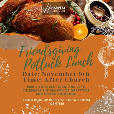 Join us after church on November 9th for a Friendsgiving potluck feast! Sign up sheet is at the welcome center. All are welcome!